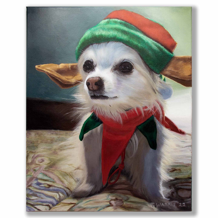 Bryn was a difficult dog - being a popular breed, I suspect he was taken from his mother too early, he had many behavour issues and was really a one person dog. That person being me. He had the heart of a wolf, and this painting captures one of my favorite moments of him in his little elf hat, taken back in 2014 when he was still fluffy.